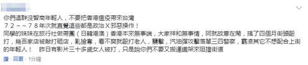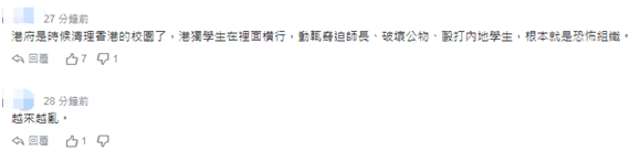 針對台當局此番協助台灣學生返台,有部分島內網友留言提及香港的校園、社會情況,並認為香港特區政府是時候清理香港的校園了,“港獨學生在裏面橫行,動輒脅迫師長、破壞公物、毆打內地學生,根本就是恐怖組織。”“越來越亂。”