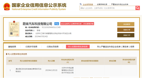 此前不久,根據國家企業信用信息公示系統顯示,蔚來汽車科技有限公司於2019年11月1日被北京市市場監督管理局北京經濟技術開發區分局列入經營異常名錄,被列入的原因是“通過登記的住所或者經營場所無法聯繫”。