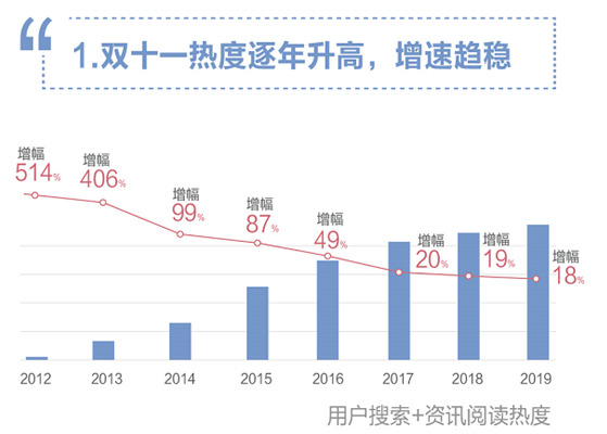 數據顯示,2019年,“雙十一”走到了第11年,網友對購物節的熱情仍沒有衰減。過去11年,“雙十一”的用户關注度持續攀升,但是增速趨於平穩。