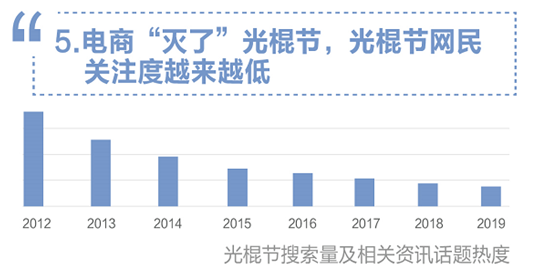 報告顯示,“購物津貼”、“店鋪優惠”、“湊單滿減”、“預售定金”等登陸今年“雙十一”購物相關搜索熱詞。隨着購物狂歡重新定義了“雙十一”,“光棍節”的關注度正在連年下降,人們記住了購物節,而逐漸忘記了“光棍用購物安慰自己”的初心。