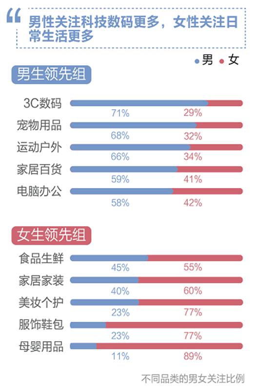 從細分用户屬性看,不同性別對於消費品類關注度也有着顯著差異。比如3C數碼、運動户外等類別的男性關注度更高;而食品生鮮、服飾鞋包等類別的女性關注度則更高。有趣的是,在“豬肉價格”關注度上,男性用户反而佔了近8成。