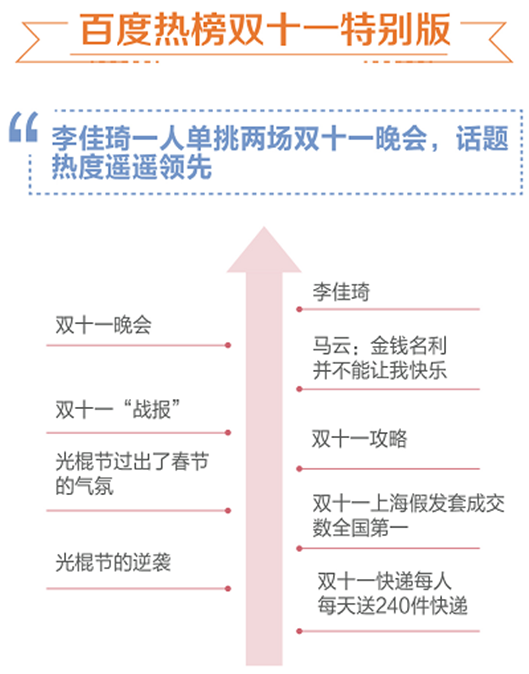 報告顯示 ,“李佳琦”相關話題成功躋身2019“雙十一”百度熱榜TOP1,甚至超過“雙十一晚會”。百度熱榜是百度App上的熱點事件榜單,依託百度搜索及信息流數據統計形成榜單排名,能夠真實且迅速的反映網絡話題在一段時間的流量熱度。