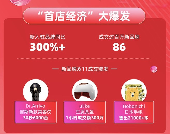 今年4月新入駐的美容儀品牌DrArrivo海外旗艦店雙11首小時成交超1000萬,單價上萬元的宙斯24K美容儀,30秒售罄6000台。以爆款生髮頭盔亮相的韓國ulike首小時成交過300萬。