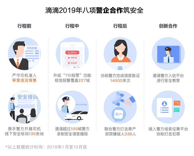 今年上半年,滴滴曾公佈與全國各地公安機關持續在司機准入、司機線下安全培訓、110報警、安全語音播報、協助警方調證和聯合打擊黑產這六方面進行警企合作,截至10月,滴滴“警企合作”取得了如下新進展: