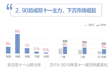 平台玩家和關注趨勢改變的同時,不難發現,消費者也在悄然的發生變化。2015年至2019年,三四五線城市用户對“雙十一”關注度增長超70%。這一數據背後,意味着下沉市場正孕育着更大的消費潛力。今年,90後用户數量佔60%,是“雙十一”電商大戰的核心“輸出”,具有一定消費能力和超前消費觀的90後成為消費主力。
