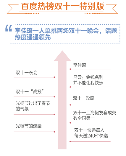 值得注意的是,網紅成為“雙十一”中不可忽視的力量,從“直播翻車”到GQ專訪,李佳琦成“雙十一”期間的話題人物,帶火了淘寶直播,也成功引發了網友們的搜索與討論。報告顯示 ,“李佳琦”相關話題成功躋身2019“雙十一”百度熱榜TOP1,甚至超過“雙十一晚會”。