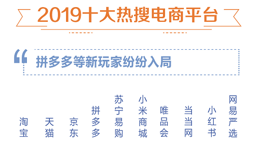 有別於以往阿里、京東的“二人轉”,今年拼多多等新玩家入局,老牌電商蘇寧易購等也不遑多讓。《報告》顯示,2019“雙十一”最受關注的十大電商平台,分別是淘寶、天貓、京東、拼多多、蘇寧易購、小米商城、唯品會、噹噹網、小紅書、網易嚴選。