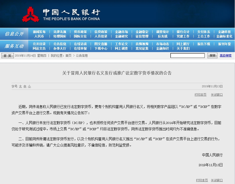 對此,人民銀行在其官網發佈公告稱,人民銀行未發行法定數字貨幣(DC/EP),也未授權任何資產交易平台進行交易。人民銀行從2014年開始研究法定數字貨幣,目前仍處於研究測試過程中。市場上交易的“DC/EP”或“DCEP”均非法定數字貨幣,網傳法定數字貨幣推出時間均為不準確信息。同時,目前網傳所謂法定數字貨幣發行,以及個別機構冒用人民銀行名義推出“DC/EP”或“DCEP”在資產交易平台上進行交易的行為,可能涉及詐騙和傳銷,請廣大公眾提高風險意識,不偏信輕信,防範利益受損。