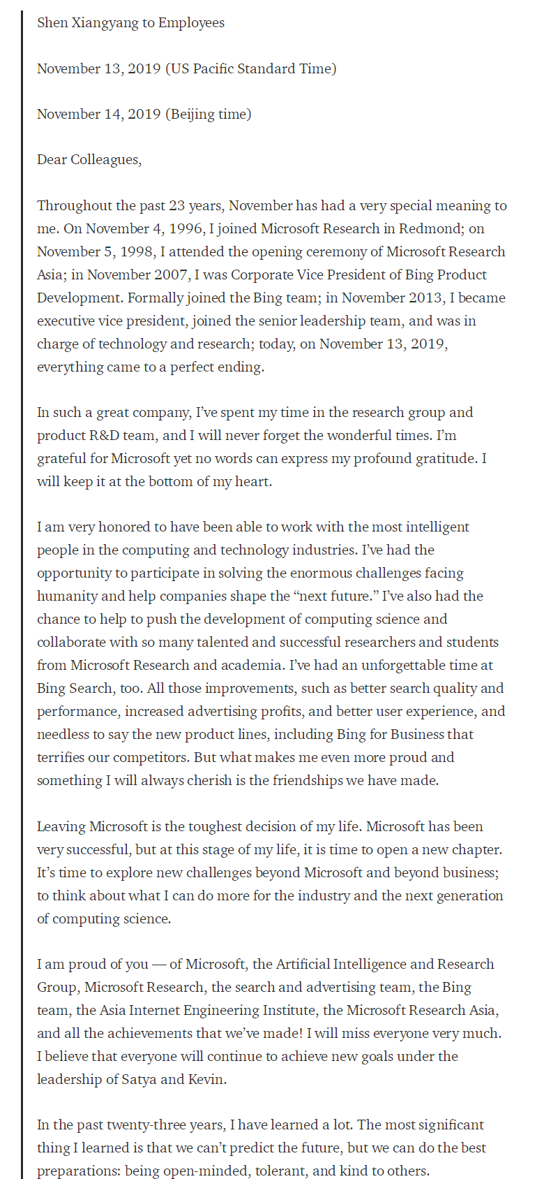 根據多家海外媒體獲得的沈向陽致員工內部信,沈向洋表示:“離開微軟是我一生中最艱難的決定。微軟已經非常成功,但是在我生命的這個階段,該開啓新的篇章了。現在是時候探索在微軟和商業層面之外的新挑戰了,去考慮我可以為行業和下一代計算科學做些什麼更多的事情。”