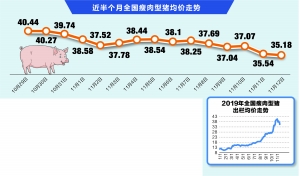 農業農村部信息中心發佈的國內瘦肉型白條豬肉出廠價格監測週報顯示,2019年第44周(10月28日~11月1日),16省(市)瘦肉型白條豬肉出廠價格總指數的周平均值為每公斤52.93元,環比跌0.9%。這是國內瘦肉型白條豬肉出廠價格自8月以來首次出現環比下跌。2019年第45周(11月4日~11月8日),豬肉價格不但連續環比下跌,且跌幅有所擴大,16省(市)瘦肉型白條豬肉出廠價格總指數的周平均值為每公斤51.01元,環比跌3.6%。