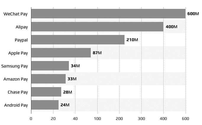 目前,美國人最常用的支付平台有PayPal、 Venmo、ApplePay、GoogleWallet 等等。這些平台允許用户直接從其銀行賬户或信用卡轉賬用於購物或收付款。除了PayPal以外,其他平台在美國並沒有達到支付寶和微信支付在中國的普及程度,多數支付平台面臨的問題是終端實體商家數量不足。目前只有不到50%的美國實體商家可以接入移動支付方式,信用卡和支票仍是主流。2018年,美國信用卡消費額佔購物總額的80%以上。PayPal是最受歡迎的非銀行支付方式,有40%的用户使用,但其主要用於在線支付。同IOS系統連接,能夠真正意義上被用作“移動支付平台”的ApplePay僅僅佔支付總額的9%。
