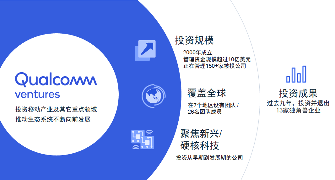 據沈勁介紹,作為一個全球運作的團隊,高通創投成立於2000年,目前在7個國家和地區設有團隊,共有26名投資經理,正在管理的被投企業超150家,累計投資額超10億美元。