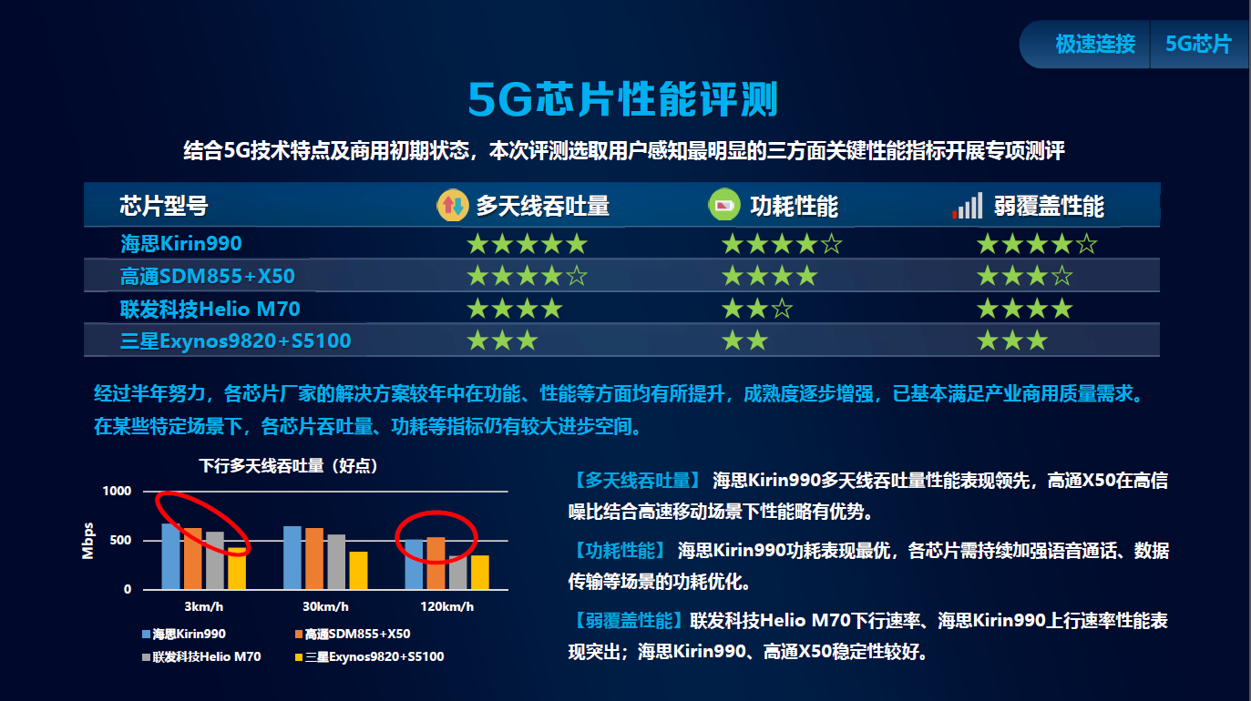 中國移動同期發佈的《中國移動2019年智能硬件質量報告(第二期)》中包含4款5G芯片和7款5G終端的全面評測,在對芯片和終端多天線吞吐量的性能評測中,“玉衡系統”還原了用户使用場景中的低、中、高速三種典型場景下各芯片和終端的表現差異,為後續終端和芯片的多天線優化方向提供參考。