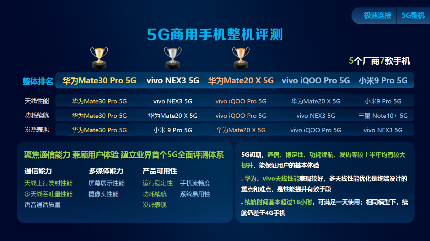 11月15日,在中國移動合作伙伴大會上,中國移動終端實驗室發佈了業界首創的5G多天線吞吐性能評估系統——“玉衡系統”,並在《中國移動2019年智能硬件質量報告(第二期)》中詳細展示了不同芯片和終端的速率性能評估結果。