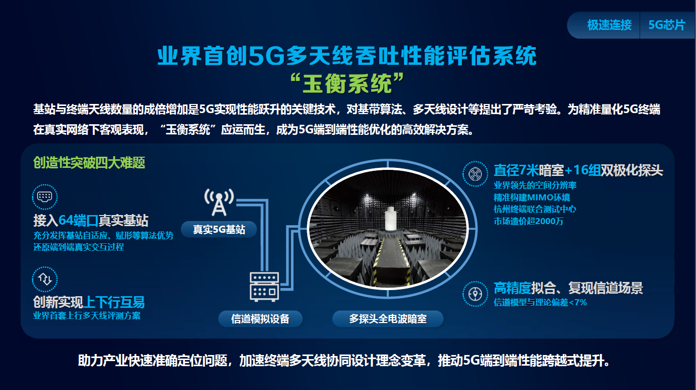 總體上,它採用真實基站+信道仿真器+多探頭暗室的方案,之所以引入64端口真實基站,是因為5G時代MassiveMIMO成為基站標配,其波束賦形、SRS聯動、預編碼等過程直接決定用户實際5G體驗。該方案准確還原終端和基站之間端到端真實的交互過程,使得評估結果更可靠更貼近現網。另外,“玉衡系統”中創造性實現了上下行信道互易的環境,克服了以往僅有下行信道環境的傳統方案缺陷,且全面支持5G Sub6GHz的端到端雙向性能測試,成為業界首套上行多天線評測方案。在工程實現上,“玉衡系統”的多探頭暗室直徑7米,內含16組雙極化探頭,精確構造上下行信道環境,具有業界領先的空間分辨率。通過逐點逐角度驗證,整套系統實現對信道場景的高精度復現,如模擬低、中、高速場景,其信道模型與理論偏差小於7%。