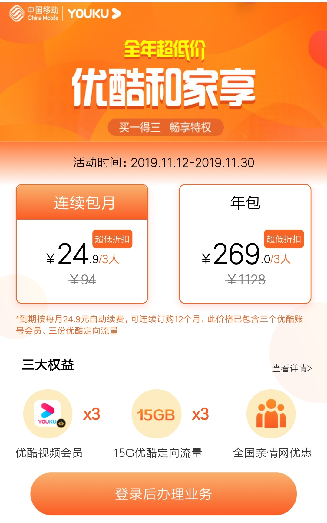 26日,“和家享”會員套餐在優酷視頻與中國移動客户端同步上線,11月促銷期間月包價格24.9元,總價值1128元年包價格為269元。