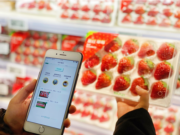 在位於上海青浦白鶴鎮的草莓大棚裏,農户蔣先生介紹,自從與中化和盒馬達成合作以來,基地以中化提供的種植方案為基礎,利用智慧農業系統,記錄草莓的產區環境、生長日誌、農事記錄、品質檢測以及採後等的全過程。每一個購買了“葲葒草莓”的消費者,都可以在盒馬App上看到這些溯源信息。