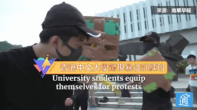 今年10月份,有港媒披露出學生抗爭組織“香港大專學界國際事務代表團”在香港中文大學校內開辦“暴徒訓練班”,有大批高校學生在專業教練指導下進行專業化的“暴動訓練”。