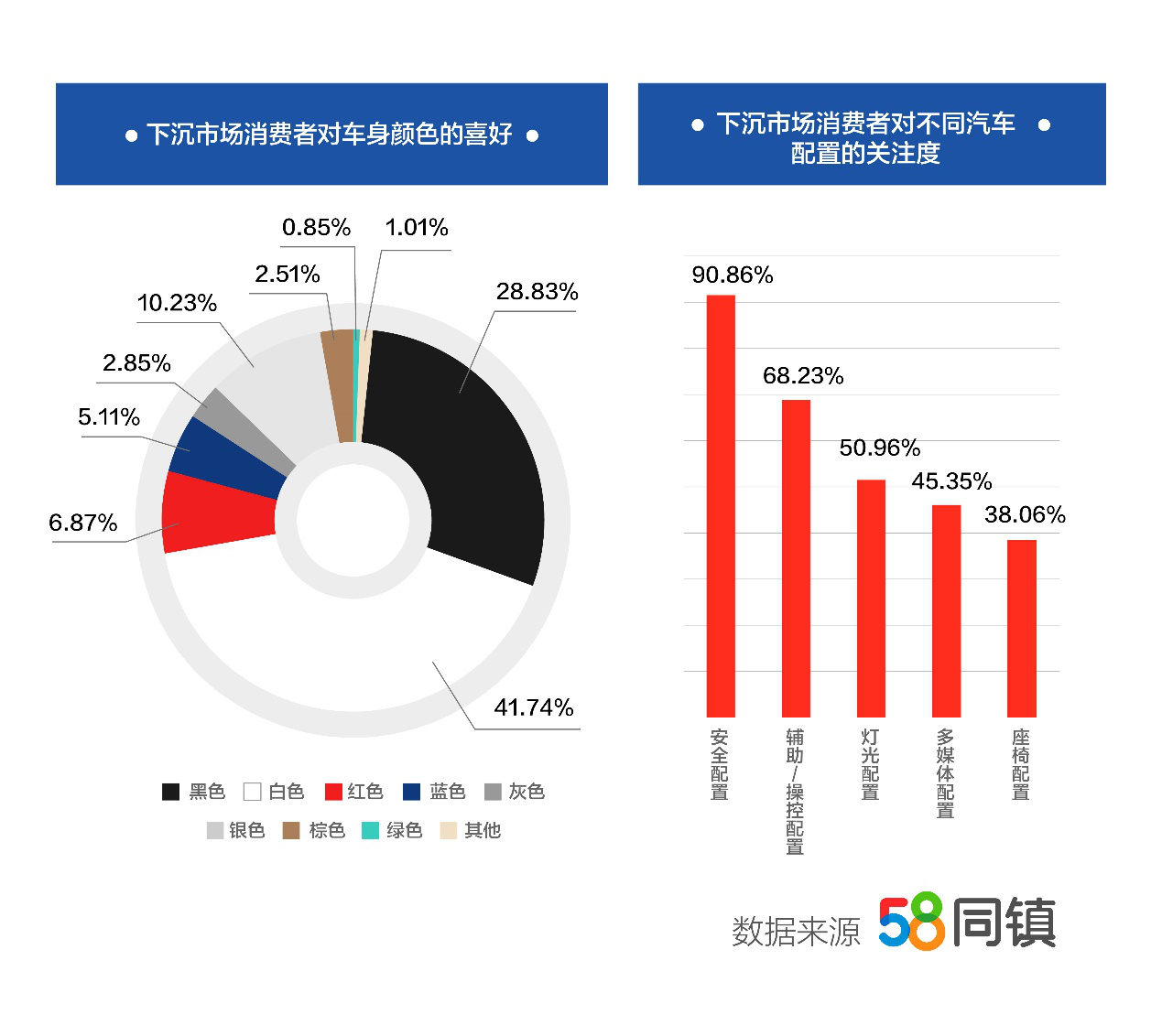 58同鎮調研數據還顯示,下沉市場消費者最喜愛的車身顏色是白色,佔比達41.74%。其次是黑色和銀色,佔比分別為28.83%和10.23%。在汽車配置方面,90.86%的下沉市場消費者關心車輛安全配置。