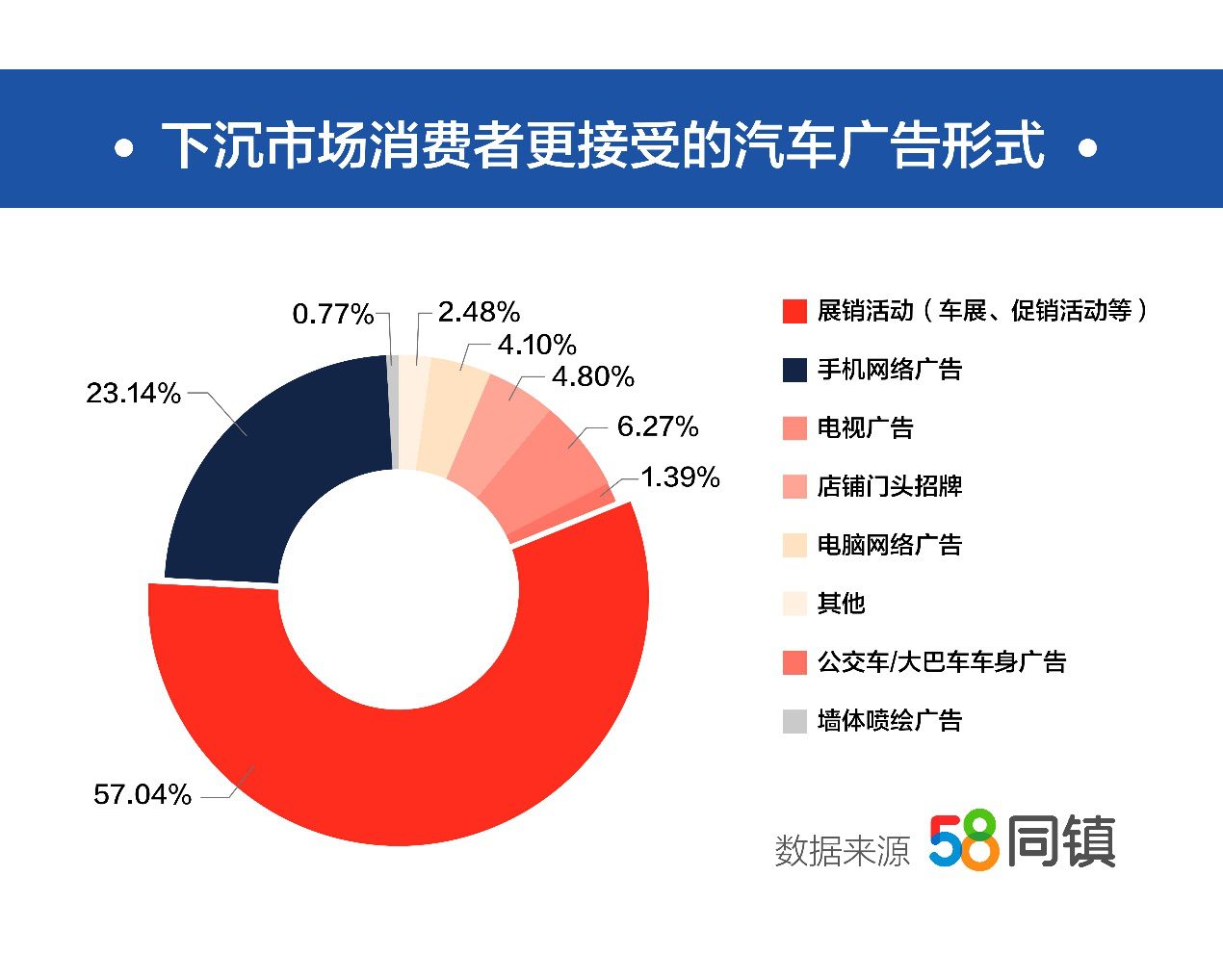 58同鎮同時對下沉市場的廣告效果進行了分析,車展等線下營銷方式更容易被接受。由於下沉市場是一個“熟人社會”,用户更注重口碑傳播和熟人推薦,對線下渠道和看車體驗尤為重視。而在線上,依託手機廣告的營銷,則是獲得下沉市場用户的最好方式。這是因為隨着智能手機的普及,縣鎮用户普遍擁有運用閒暇時間上網瀏覽信息的偏好,這讓線上購車廣告有了“用武之地”。