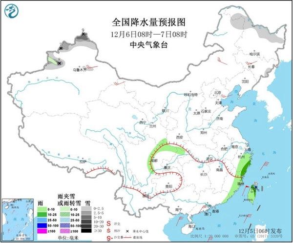 中央氣象台預計,今天,新疆北疆北部、內蒙古東北部、黑龍江西北部、貴州西部、山東半島北部等地的部分地區有小雪或雨夾雪。江南東部、華南東部、重慶西部和南部、貴州、雲南中東部等地有小雨,其中,浙江東南部、福建東部、廣東東部、台灣島等地的部分地區有中雨,局地大雨或暴雨。