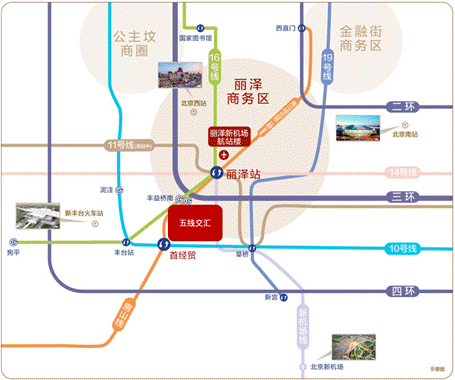 通過新機場北延線無縫接駁新機場,麗澤金融商務區還可與中關村(創新園、永豐園、軟件園、核心區)、CBD北京商務中心區、望京等重點功能區快速連接,並通過與北京南站、北京西站、豐台火車站等重要對外交通樞紐,與雄安新區、天津濱海新區等實現接駁,進一步增強麗澤對外輻射作用,有效促進京津冀一體化協同發展。