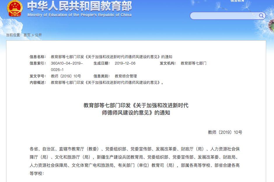 近日,教育部、中央組織部、中央宣傳部、國家發展改革委、財政部、人力資源社會保障部、文化和旅遊部印發《關於加強和改進新時代師德師風建設的意見》。