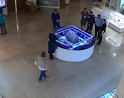 從博物館監控視頻可以看出,當地時間14日,裝有隕石展品的玻璃保護罩自行升起來,又自行降落,很多參觀者被吸引過來,並圍觀拍照。