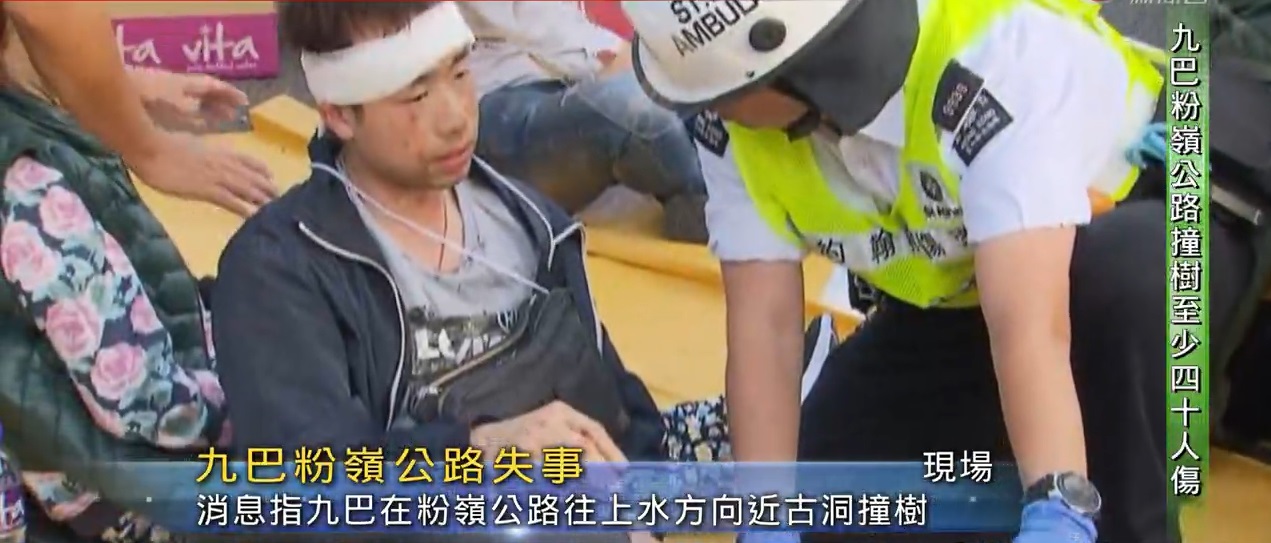 據報道,今日(18日)下午16時18分,粉嶺公路往上水方向近松柏塱,一輛九巴撞樹,巴士上層嚴重撞毀,意外造成4人當場死亡,30餘名乘客受傷,其中3名乘客跌出馬路重傷,3人中1人昏迷,多輛救護車到場救援。