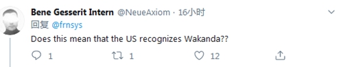 網友Bene Gesserit Intern説,“這是不是意味着,美國承認瓦坎達真實存在??”↓