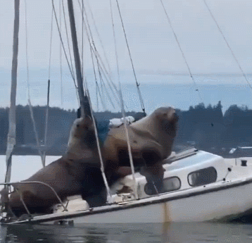 【環球網報道 記者 温家越】冬天的海水一天比一天冷,而對於懶洋洋的海獅來説,“搭便船”大概是件“誘人”的事。據英國《每日郵報》19日報道,近日,在美國華盛頓州皮吉特灣,兩隻巨大的海獅就“徵用”一艘帆船。不過因為船太小了,平均體重近660磅(約合600斤)的海獅幾乎要將其壓沉……