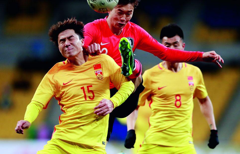 12月15日,中國國家男足選拔隊球員明天(左)和韓國隊球員金珍洙(中)在比賽中拼搶。當日,在韓國釜山舉行的2019東亞杯男足比賽中,中國國家男足選拔隊以0比1不敵韓國隊。圖/新華