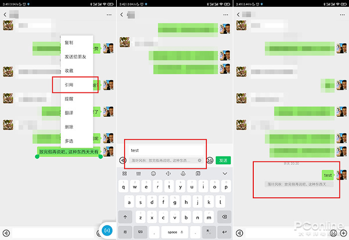 7.0.10版在引用消息的顯示效果上相比PC版更好,原文和回覆語之間加入了明顯的色彩區分,而不再是PC版那個簡單的分隔線。當然這也需要看接收者的微信版本了,如果版本號低於7.0.10,那麼顯示出來還是和PC版一樣。