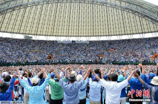 資料圖:日本沖繩民眾舉行集會,要求美軍立即歸還普天間基地並放棄在沖繩邊野古新建美軍基地。