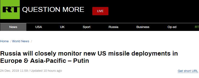 (RT:俄羅斯將密切關注美國在歐洲和亞太的新導彈部署--普京)