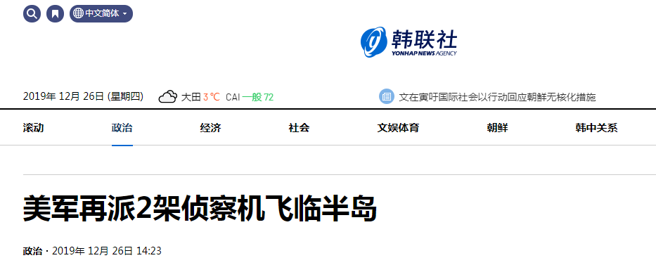 【環球網綜合報道】韓聯社26日消息稱,在朝鮮預告給美國送上“聖誕禮物”的情況下,美軍26日當天再次派出2架偵察機飛臨韓半島上空,進一步加強對朝監視。
