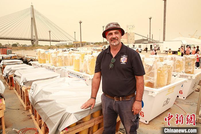 12月29日,悉尼市政府在格里布島舉行新聞發佈會,介紹悉尼跨年慶典煙花表演準備情況。逾10萬支煙花已裝船就緒,標誌着悉尼跨年慶典煙花表演進入倒計時。圖為煙花表演總指導福爾圖納託⋅福蒂在煙花裝船現場。中新社記者 陶社蘭 攝