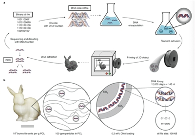 今年12月,哥倫比亞大學著名專家、以色列計算遺傳學家亞尼夫·埃爾利赫與蘇黎世聯邦理工學院報告了一種運用“萬物DNA”特殊材料3D打印出來的“兔子”,該材料包含了用以合成DNA編碼的兔子藍圖。之後,原始兔子所含的DNA被解碼,並穩定複製了五代兔子。這種新的存儲架構,意味着DNA存儲的潛力又被進一步拓展。