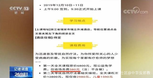 浙江温州 瑞安市市場監督管理局東山所副所長 方劍飛:這個案件現在已經基本的查實了。當事人就是組織活動的,主辦者戴某某,發佈了虛假的信息招收學員,收取了參加學習的人的學費6960元,但她培訓的課程中宣傳的信息,沒有任何的科學依據或者醫學的驗證。其行為涉嫌詐騙,目前該案件已經移送公安機關,進行後續的查處。