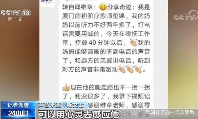 浙江瑞安 陳女士:她上面説的就是,撫摸可以治療百病。她是叫我們去學,她説她幫我們隔空治療也可以,在外地工作,家裏有老人有什麼毛病,可以用心靈去感應他。
