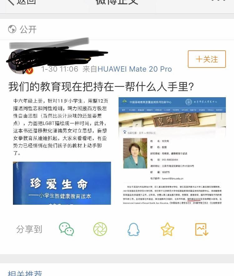 在它出版後不久,一個微博大V突然對該教材開火,曬出部分截圖稱“我們現在的性教育都把握在什麼人手裏?”