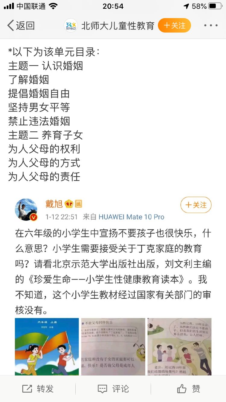 1月12日晚,博主@戴旭 發博文抨擊一本六年級的小學生性教育讀本,稱其“宣揚不要孩子也快樂”的價值觀是不符合國家規定的。