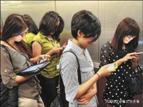 看手機的人也被稱作低頭族,無論何時何地都作“低頭看屏幕”狀,想通過盯住屏幕的方式,把零碎的時間填滿的人。低頭族英文單詞Phubbing,由澳大利亞麥肯和Macquarie大辭典聯手精心杜撰而來,形容那些只顧低頭看手機而冷落面前的親友的“低頭族”。