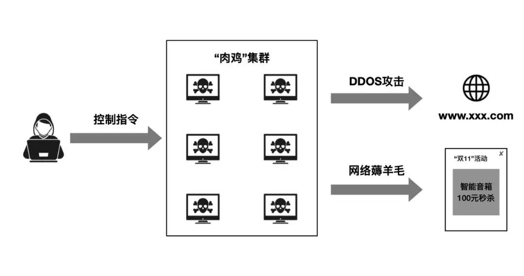 2、構建殭屍網絡:羣體攻擊,可能是黑產公司行為。失陷機器會淪為肉雞,攻擊者控制批量肉雞進行商業變現。