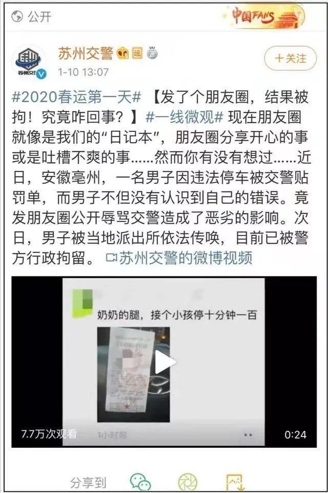 1月10日,蘇州交警官方微博發佈了亳州交警查處的一則朋友圈辱警事件:一男子因違法停車被交警貼罰單,事後他將這張罰單拍照發在自己的朋友圈中,並配文“奶奶的腿,接個小孩停十分鐘一百。”次日,該男子被當地派出所傳喚,並被行政拘留。據報道,這條微博一小時閲讀量衝到50萬,評論轉發近萬人,幾乎都是質疑的聲音。