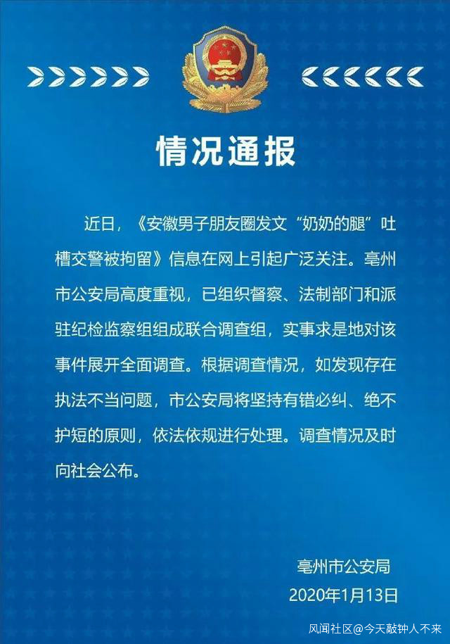 1月13日中午,亳州公安局官方微博做出回應:“亳州市公安局高度重視,已組織督查、法制部門和派駐紀檢監察組組成聯合調查組,實事求是地對該事件展開全面調查。根據調查情況,如發現存在執法不當問題,市公安局將堅持有錯必糾、絕不護短的原則,依法依規進行處理。調查情況及時向社會公佈。”