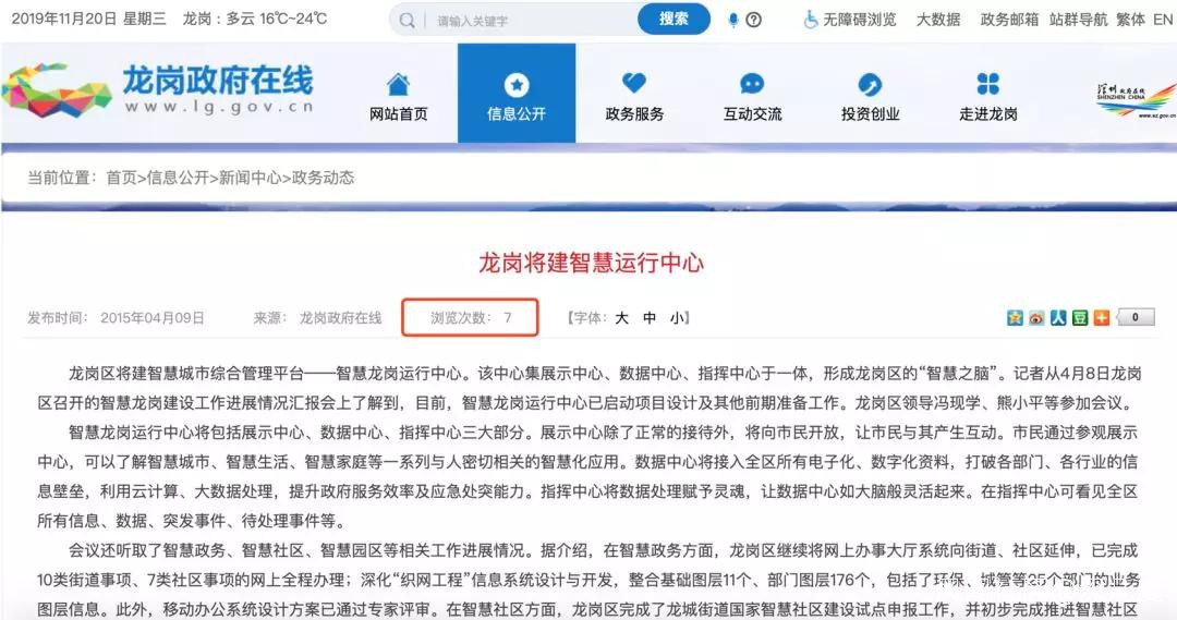 2015年4月9日,當時的深圳龍崗政府在線發佈了一則不起眼的新聞稿——《龍崗將建智慧運行中心》,當時這篇稿件開頭寫了這樣一段話: