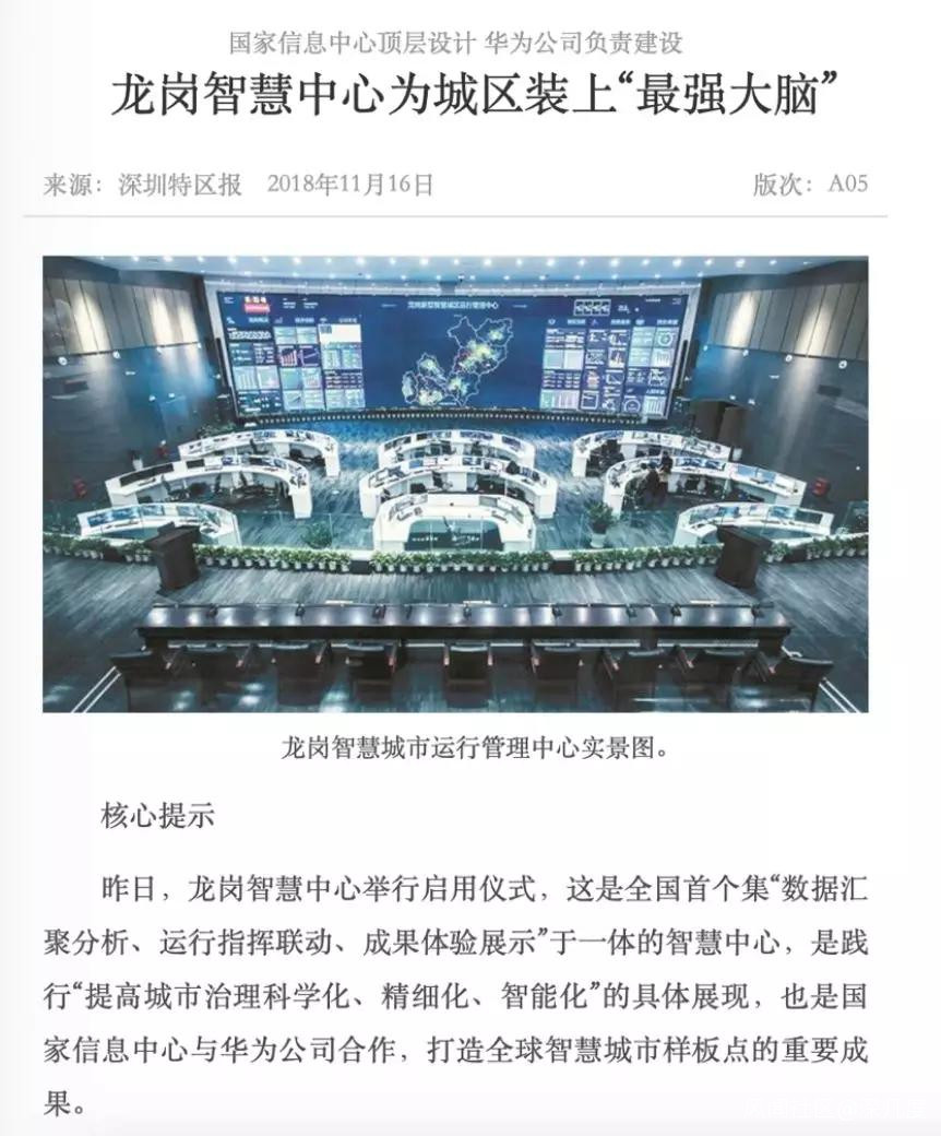 一年後的2018年11月16日,《深圳特區報》A06版面刊載了一篇名為《龍崗智慧中心為城區裝上“最強大腦”》的文章。這篇文章的副標題是——國家信息中心頂層設計,華為公司負責建設。