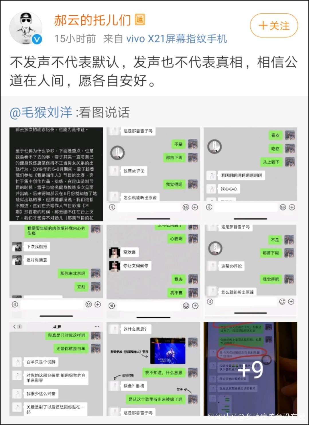 稍晚時分,民謠歌手宋冬野轉發劉洋的微博,併發文力挺郝雲。他表示:“説到底還是家務事,雖然我略知內情,但仍不能妄議,八竿子打不着的旁人就都散了吧。我只能説,認識郝雲多年,説他家暴,個人覺得太扯了;但不管借什麼機,借什麼社會敏感議題來誣陷他人,都是錯的。”