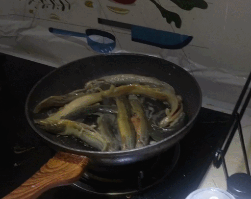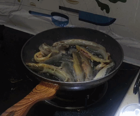 我們倆磨磨唧唧洗到最後,魚到下鍋時終於死了一批。但下鍋後的場面,仍然是……